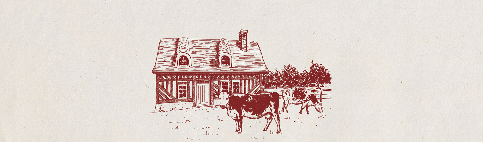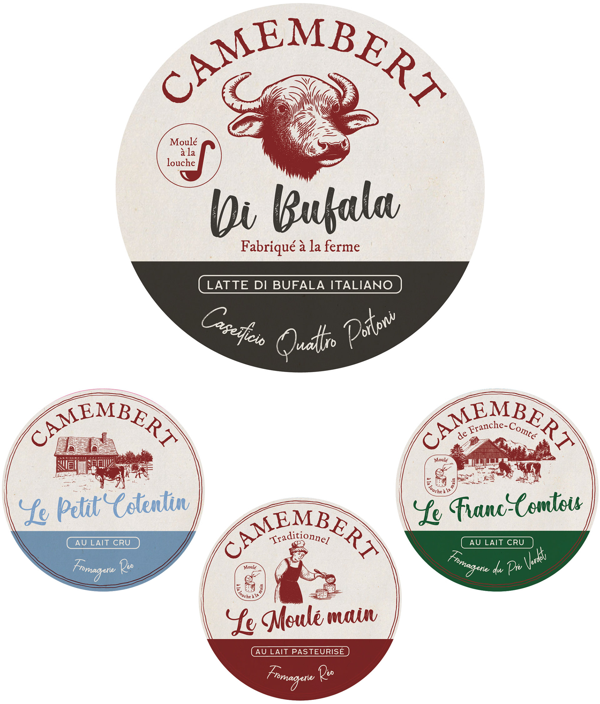 Illustrations style gravure pour des boîtes de camembert.